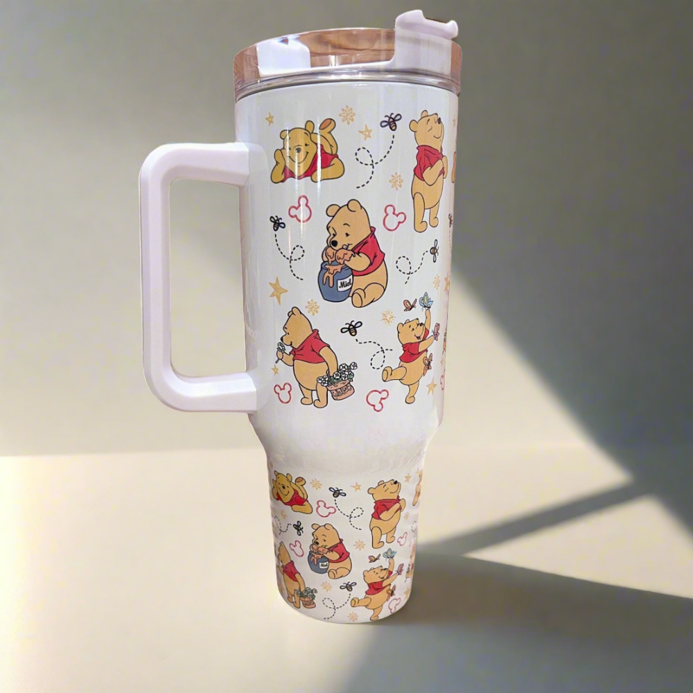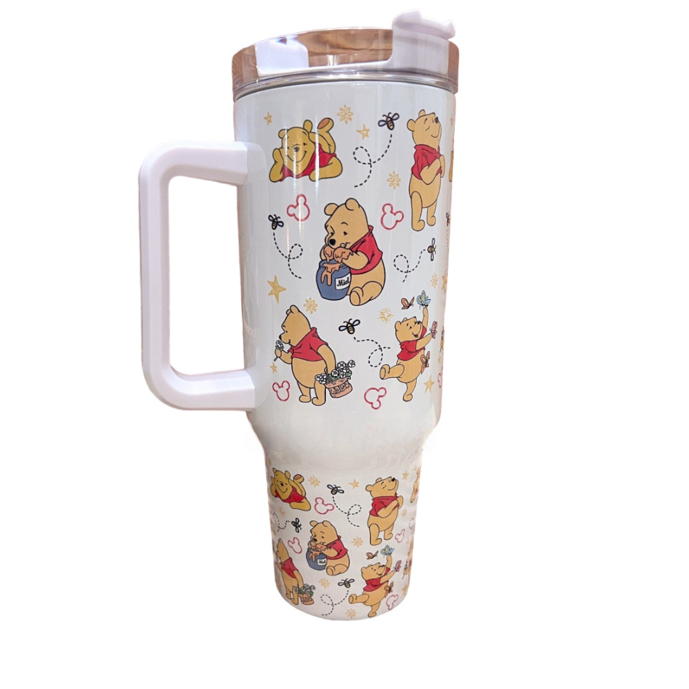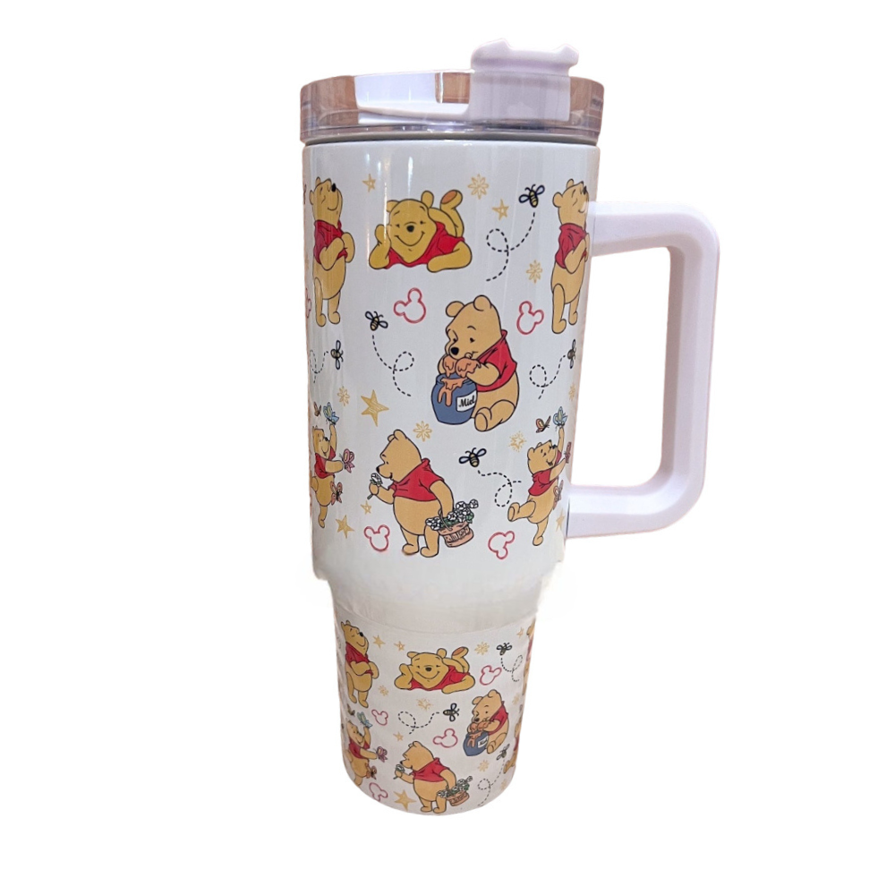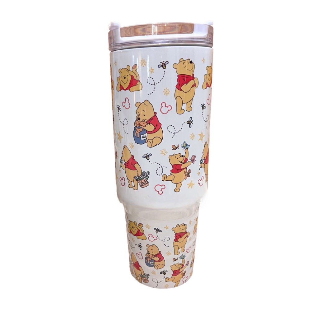 Bring a touch of whimsy to your beverage routine with our Pooh Magic Park 40 oz Travel Tumbler. Featuring charming illustrations of a bear enjoying honey, this tumbler adds a playful element to your daily coffee or tea.